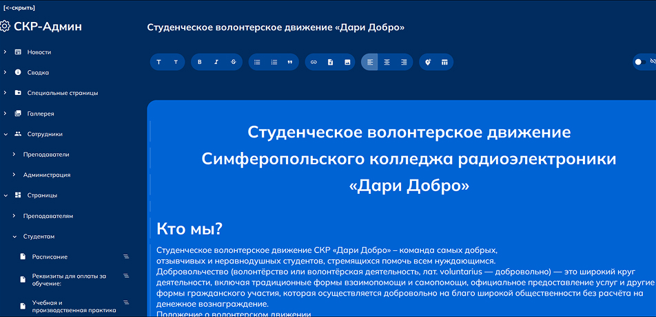 Отвечал за разработку клиентской части сайта, админку и редактор контента на базе Tiptap.